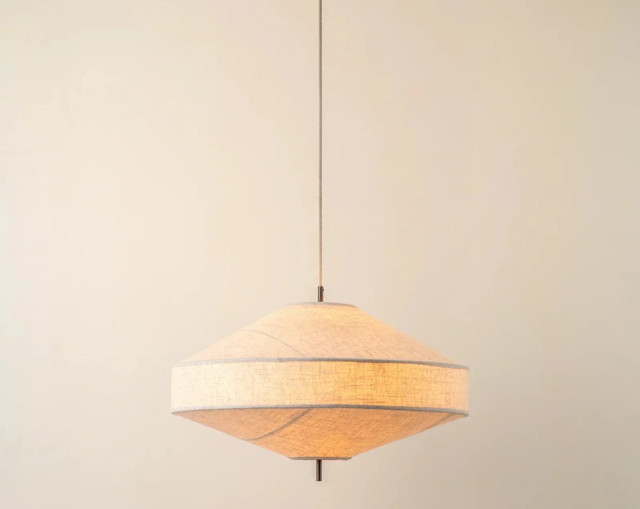 A sculptural balance of form and texture, the Aomi Pendant Lamp features layered linen around a refined metal frame, casting a soft, warm ambient glow.