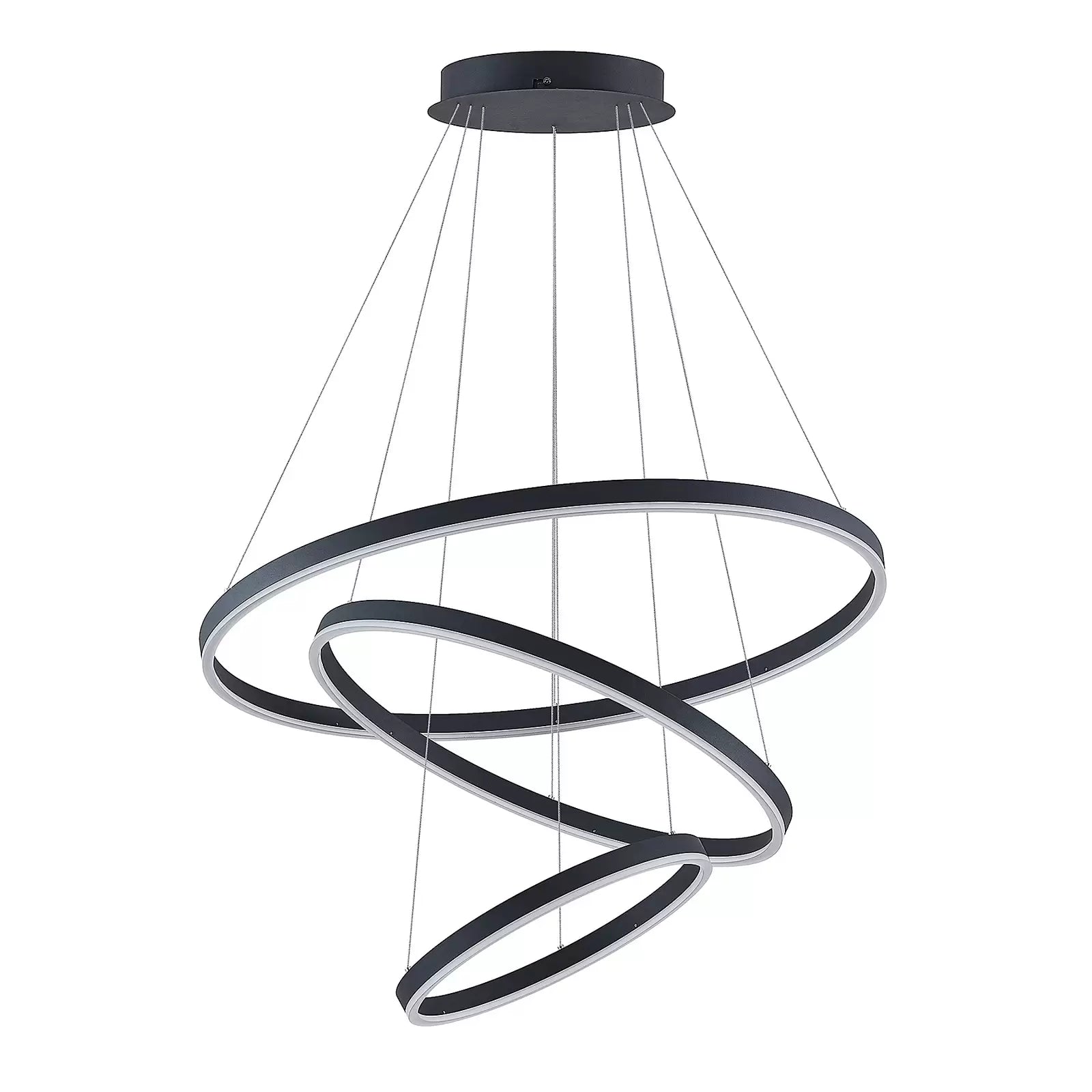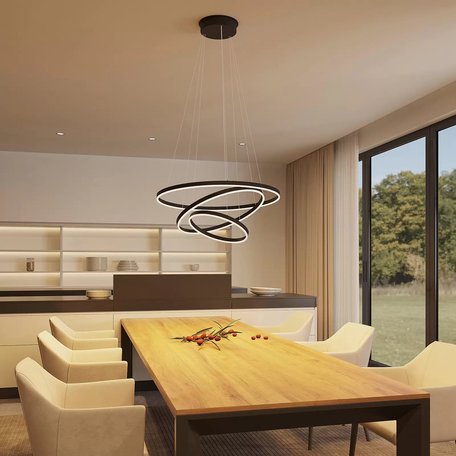 • Armonía arquitectónica: Elegantemente suspendido, el trío de anillos de aluminio del Clarion proyecta un resplandor LED cálido y acogedor, perfecto para crear una atmósfera refinada.