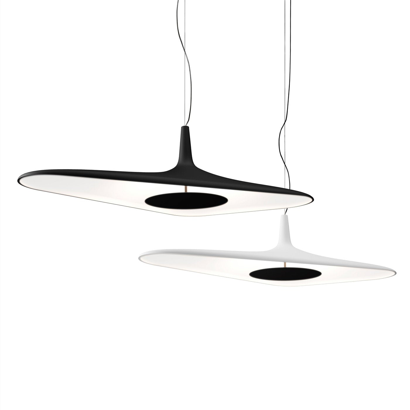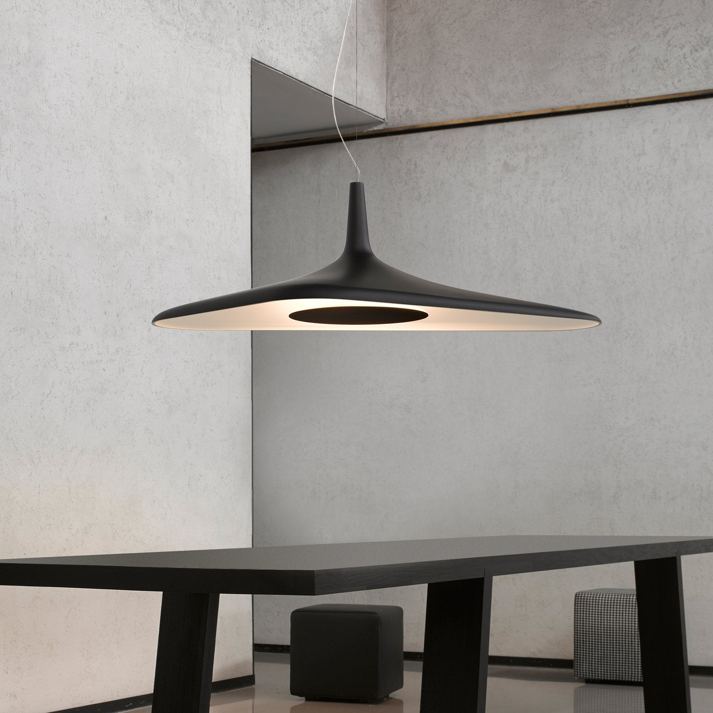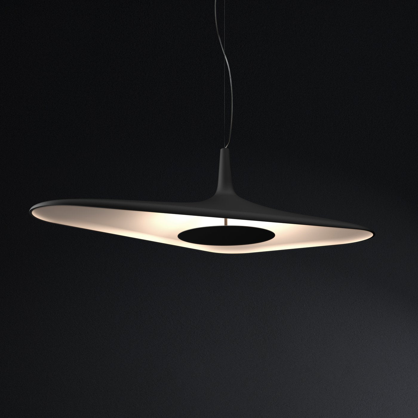 Suspended design creates sculptural contrast, merging art and illumination seamlessly.
