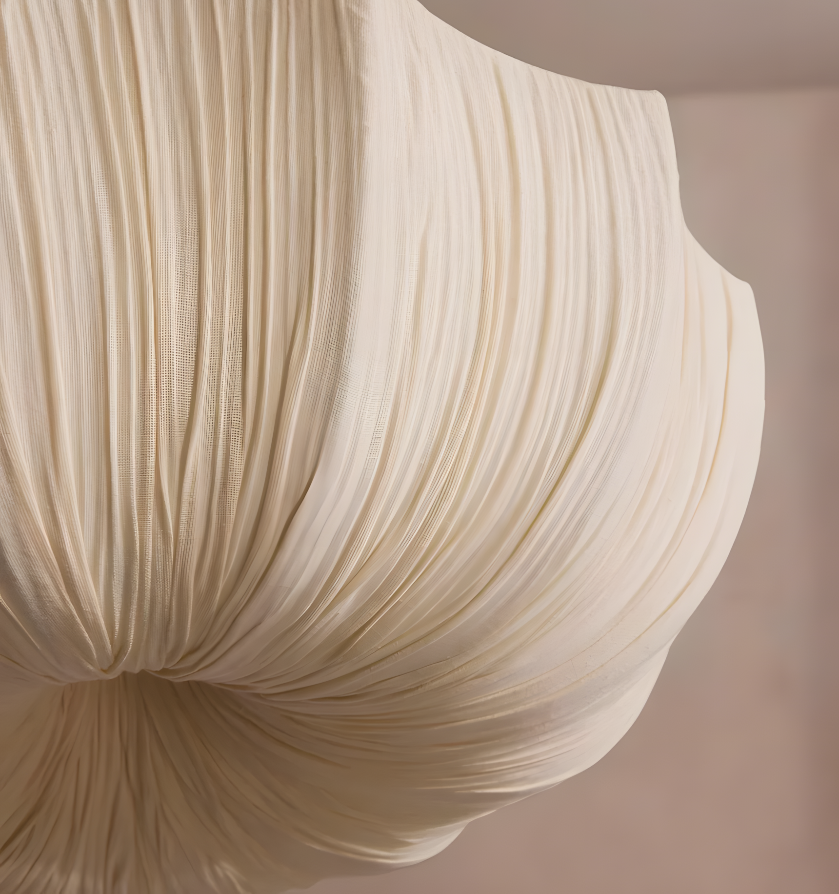 Combining sculptural fabric layers with refined metal detailing, the Marbela Ceiling Lamp brings calm, architectural warmth to dining areas, living rooms, and sophisticated hospitality interiors.