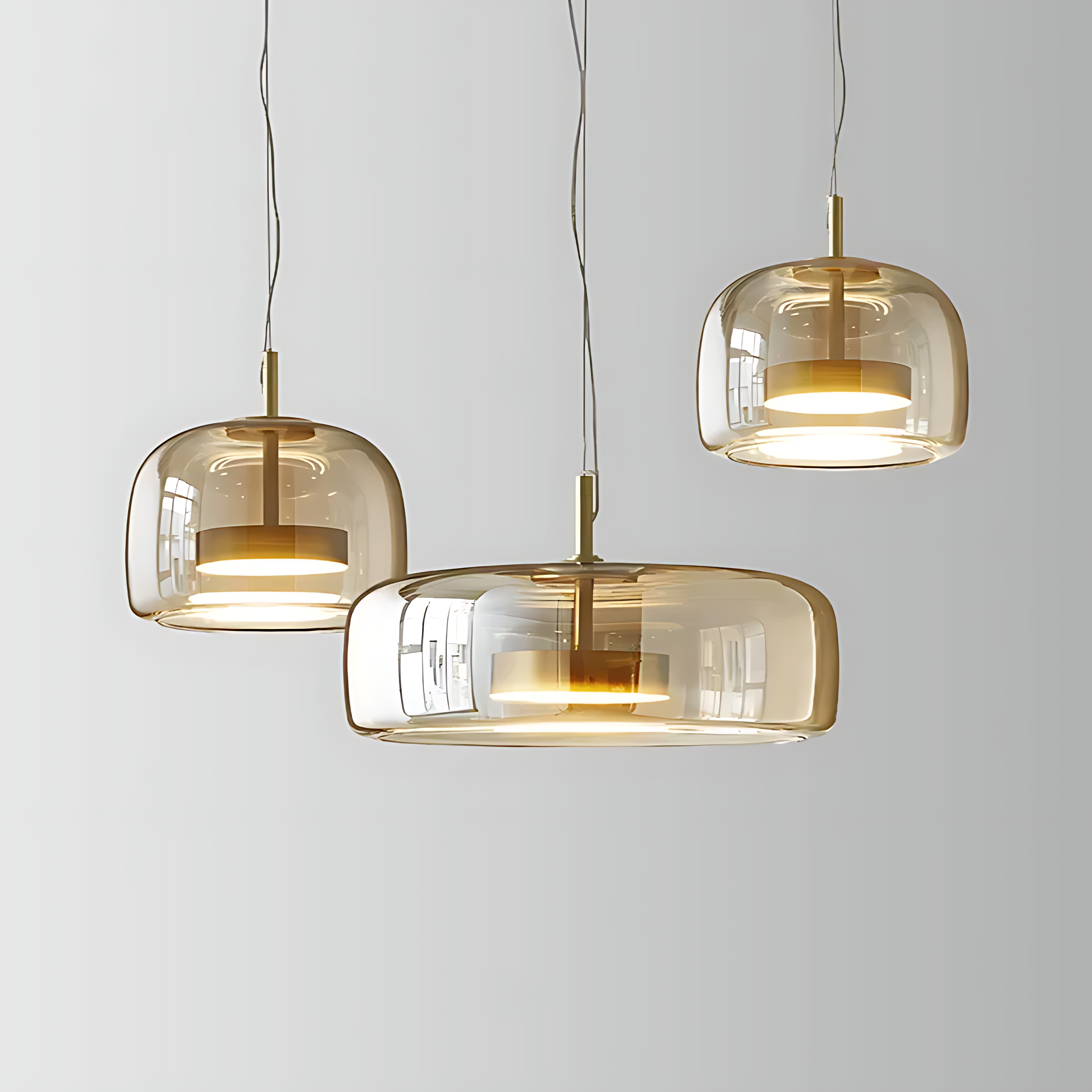 A trio of pendants creates visual rhythm and warmth for contemporary dining spaces.